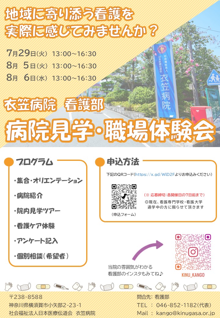 - 【衣笠病院】看護部 病院見学・職場体験会を開催いたします